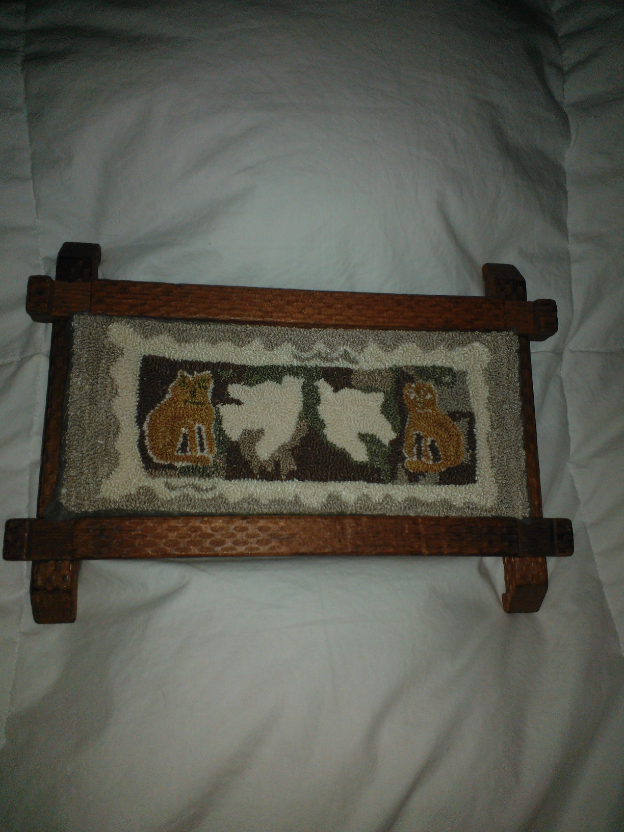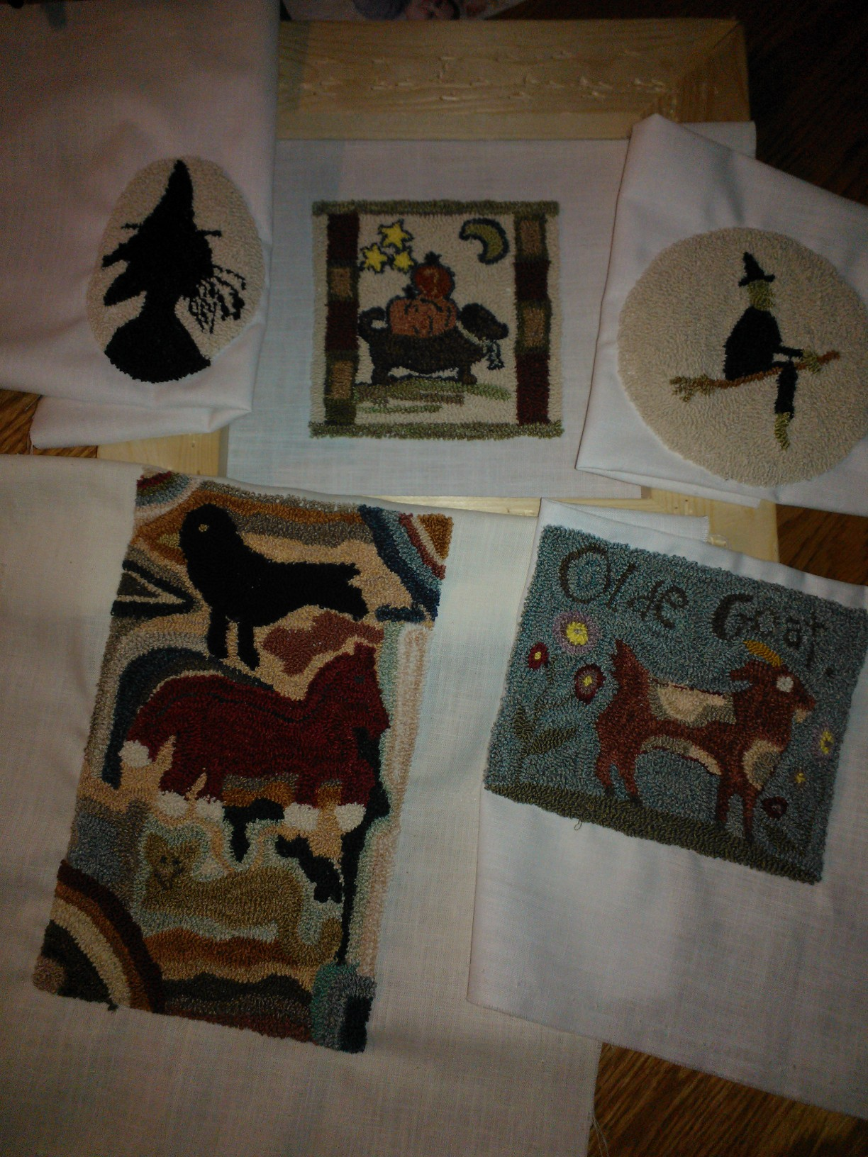 How does it happen, you suddenly have five projects that need to reach the finish line? Guess I’ll post the picture as incentive to complete some projects and show you the results. What you see here is a doodle from Primitive Betty, Olde Goat from Lori Brechlin, (Lori’s pattern was in the premier issue of the Punch Needle and Primitive Stitcher magazine) patterns from Rebecca Lindquist, and variation on Magdalena Briner rug. How will they end up? Framed? On a hornbook? What’s a hornbook? Be sure to come back and find out.