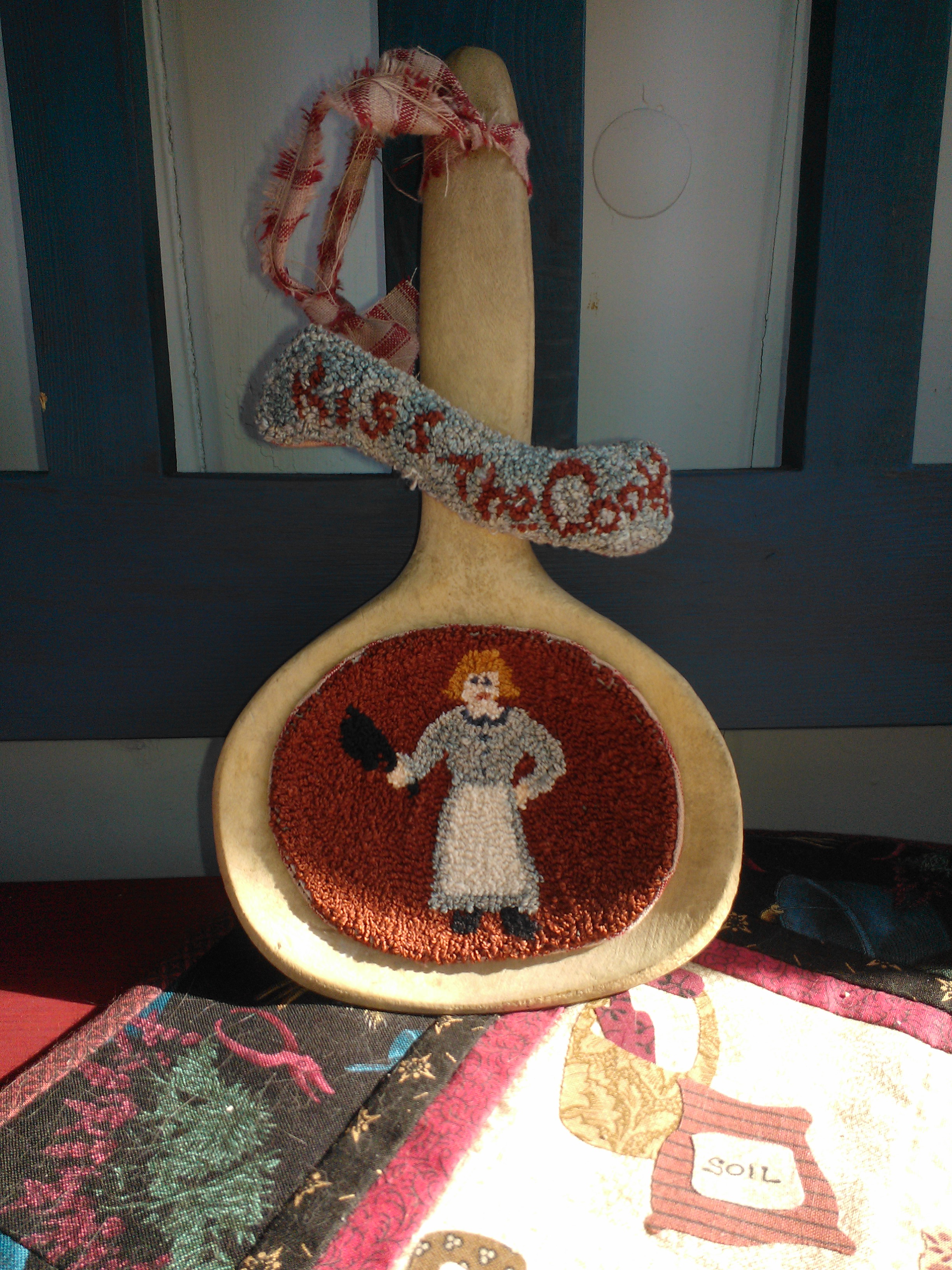 I found a beautifully illustrated book by Evelyn Lawrence and Kathy Wright filled with pictures of hooked rugs done by Magdalena Briner Eby (1832-1915) from Perry County, Pennsylvania. While Magdalena worked with wool and rug hooking, primitive design and punch needle also make a perfect pair.