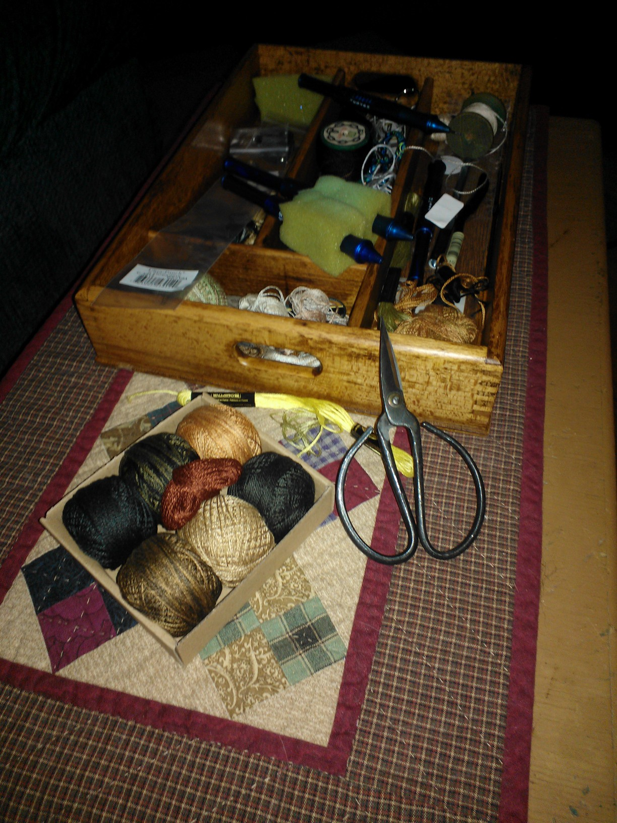 Three years ago I had never heard of punchneedle. A loose definition might be embroidery created by drawing a scene/picture on a piece of fabric (usually weavers’ cloth) and finishing with floss, perle cotton, yarn threaded through a tool called a punch needle. You do all your ‘punching’ on the back of the piece and the finished product appears on the front as loops similar to what you see in rug hooking. My sister repurposed the utensil box below. It makes a great supply box. In the picture (no points for neatness) you can see the blue Cameo punch needles. A few of them I have covered with foam for wrist comfort.