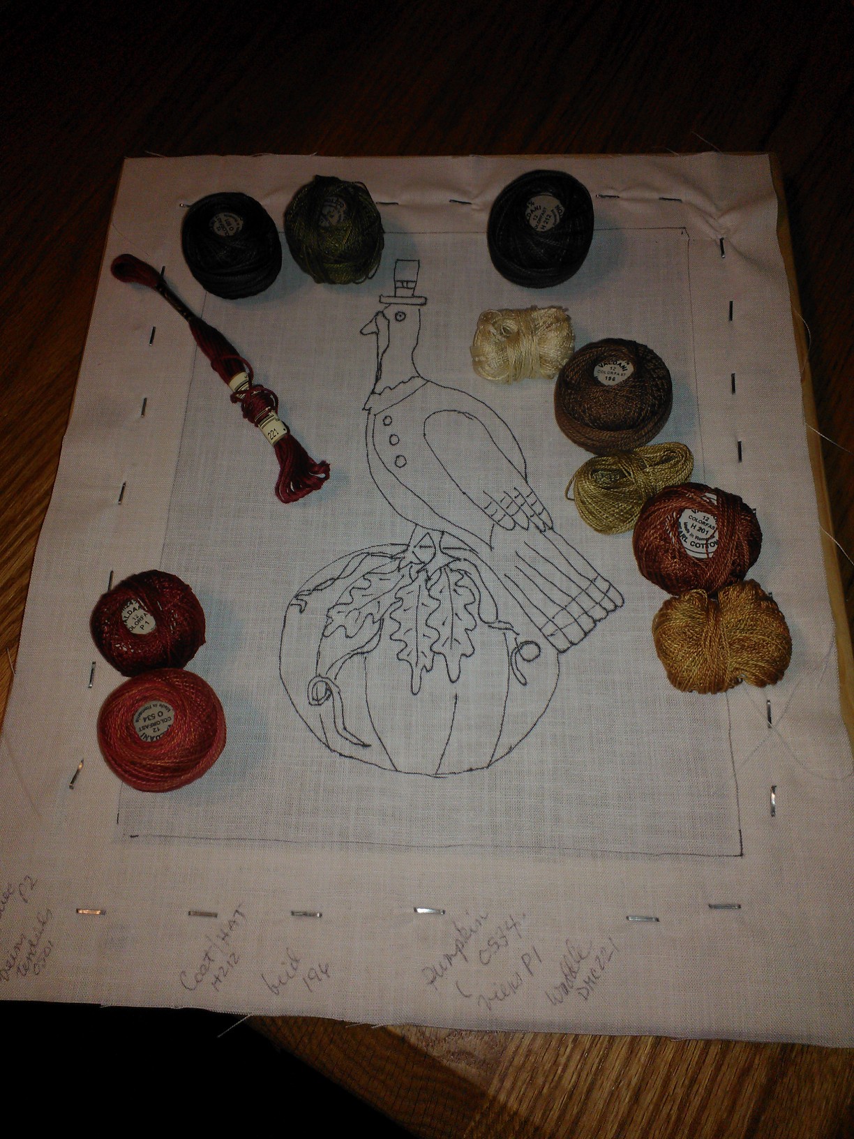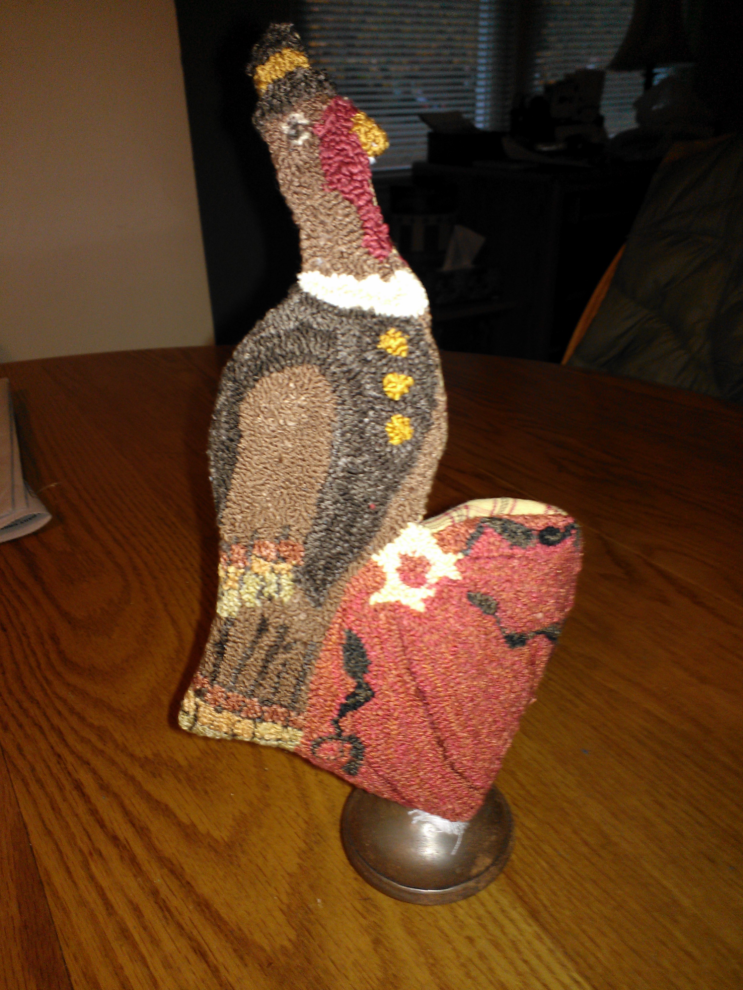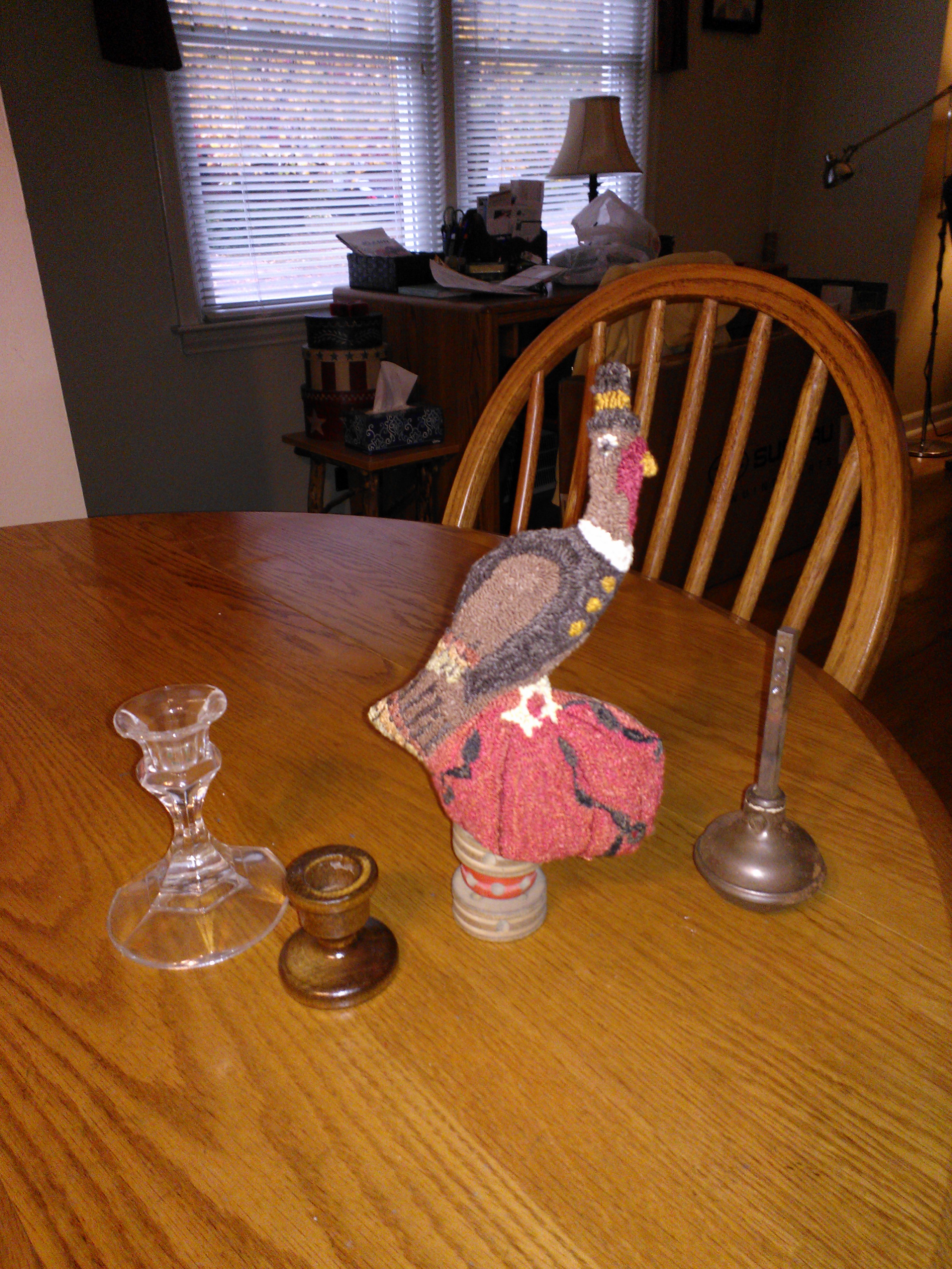 I carried Cathy’s turkey with me on our 600 mile trip, but must admit I never touched a punch needle while we were gone. So, now I’m back and I have managed to finish the punching. I’ve got Tom’s backing sewed on and turned the piece right-side out. (Very carefully turned. I held my breath when I reached the top hat.) I’m posting a few pictures of my progress. I haven’t decided how I will mount the bird. I tried the doorknob, but it seems to want to wobble. Turkeys should gobble, not wobble. I have a short little wooden candle holder, but I’m leaning towards using my Tinker Toys to form a base. Once I decide I’ll sew the pumpkin shut on the bottom. Any thoughts?