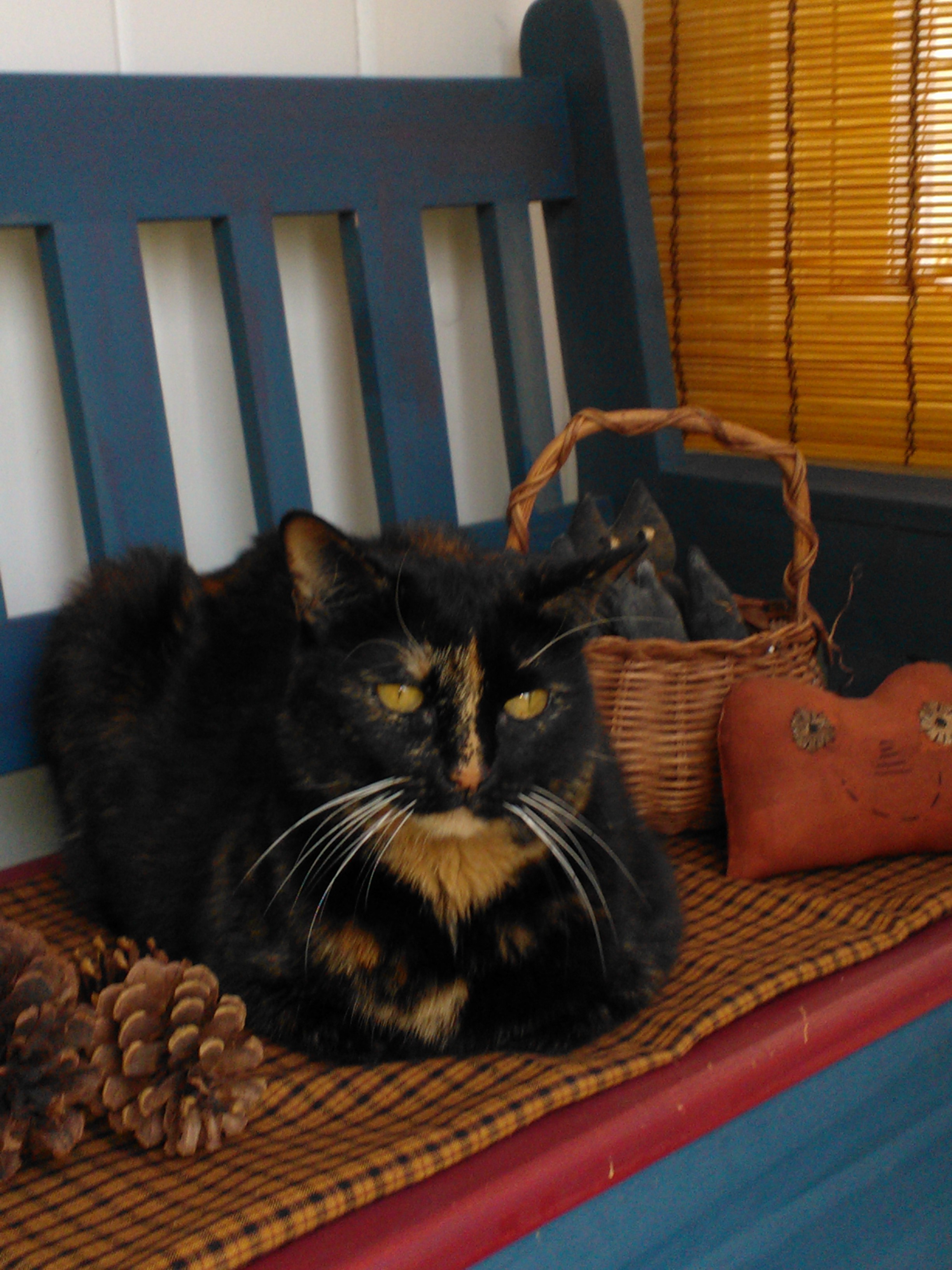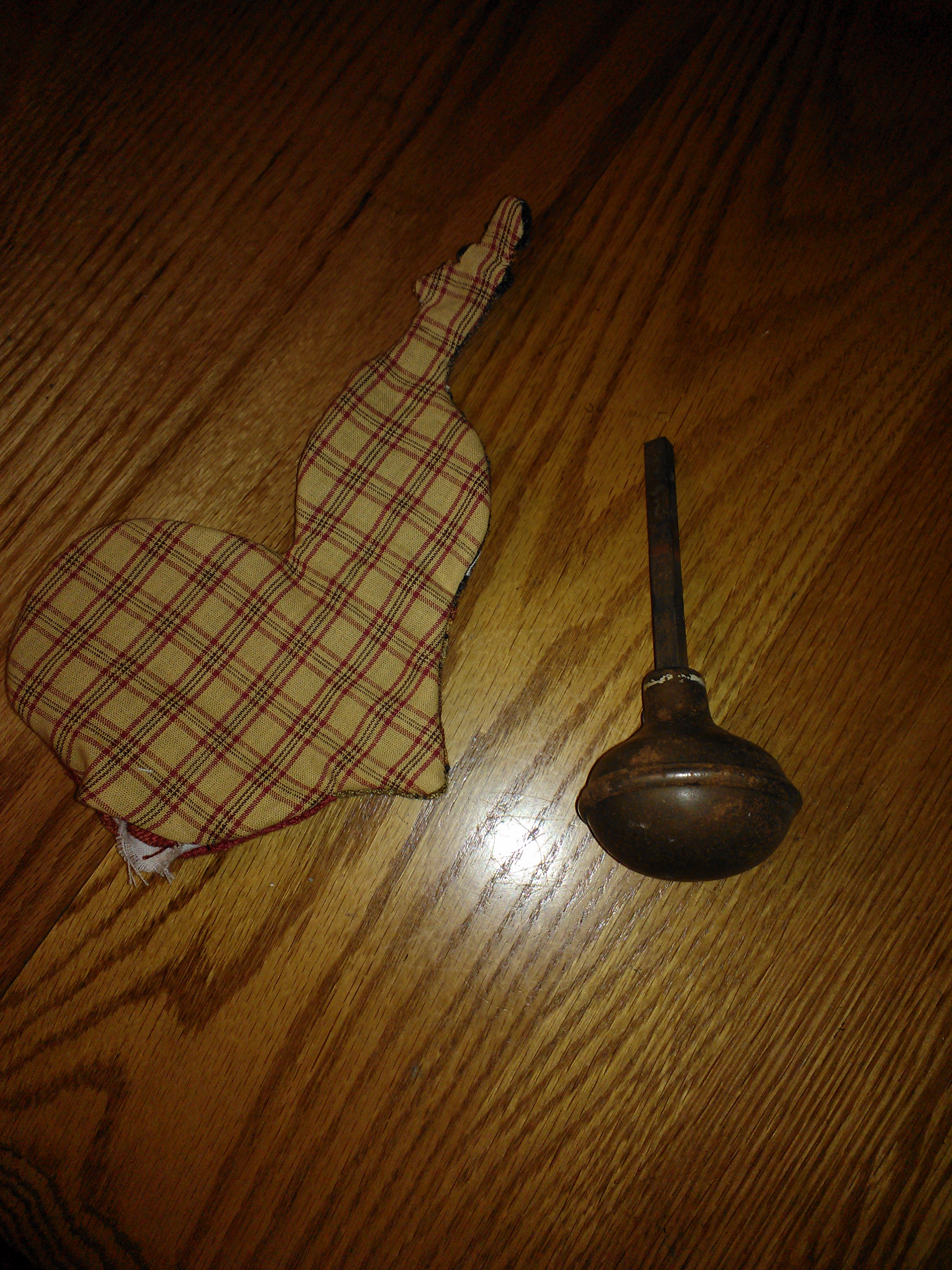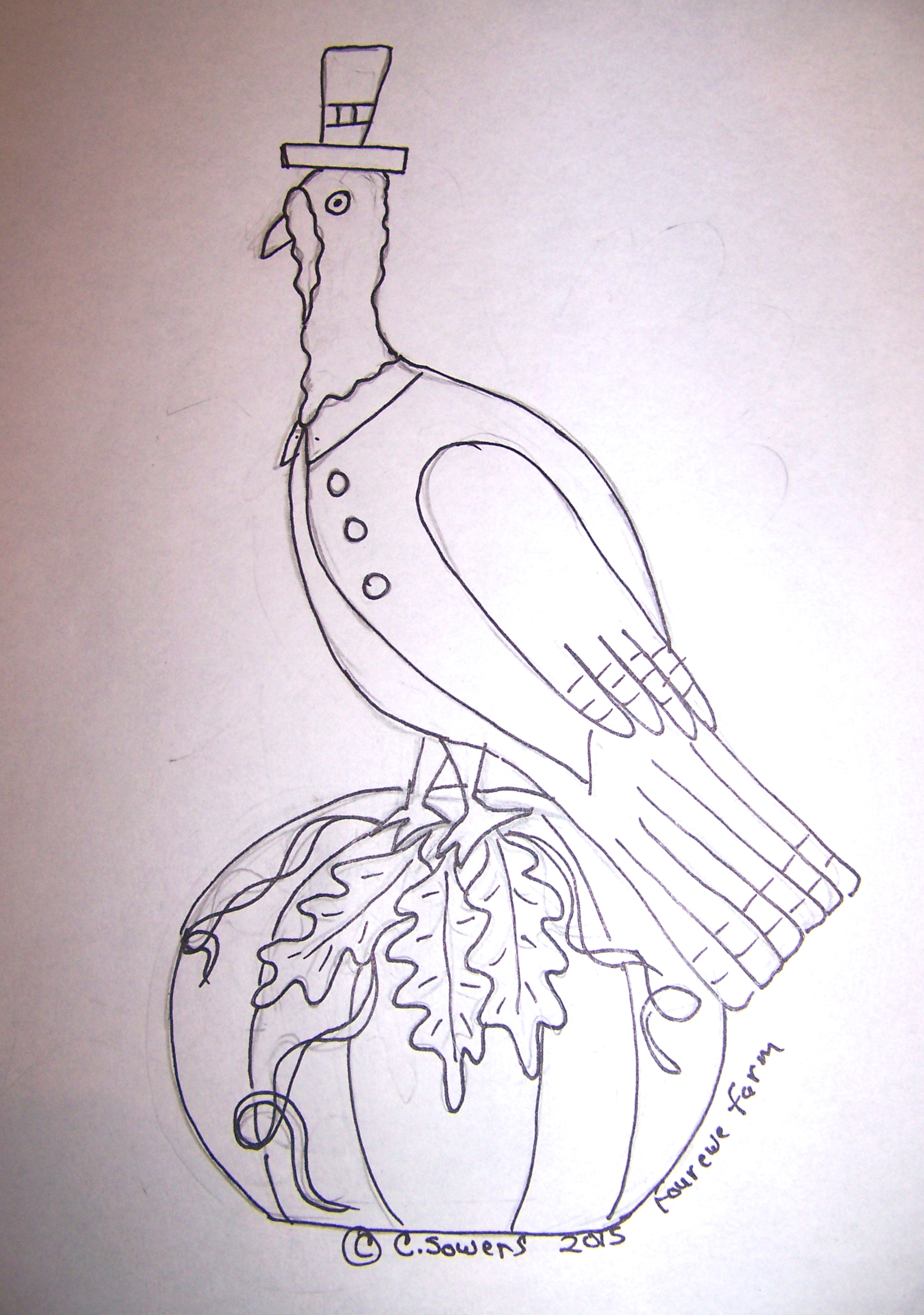 I carried Cathy’s turkey with me on our 600 mile trip, but must admit I never touched a punch needle while we were gone. So, now I’m back and I have managed to finish the punching. I’ve got Tom’s backing sewed on and turned the piece right-side out. (Very carefully turned. I held my breath when I reached the top hat.) I’m posting a few pictures of my progress. I haven’t decided how I will mount the bird. I tried the doorknob, but it seems to want to wobble. Turkeys should gobble, not wobble. I have a short little wooden candle holder, but I’m leaning towards using my Tinker Toys to form a base. Once I decide I’ll sew the pumpkin shut on the bottom. Any thoughts?