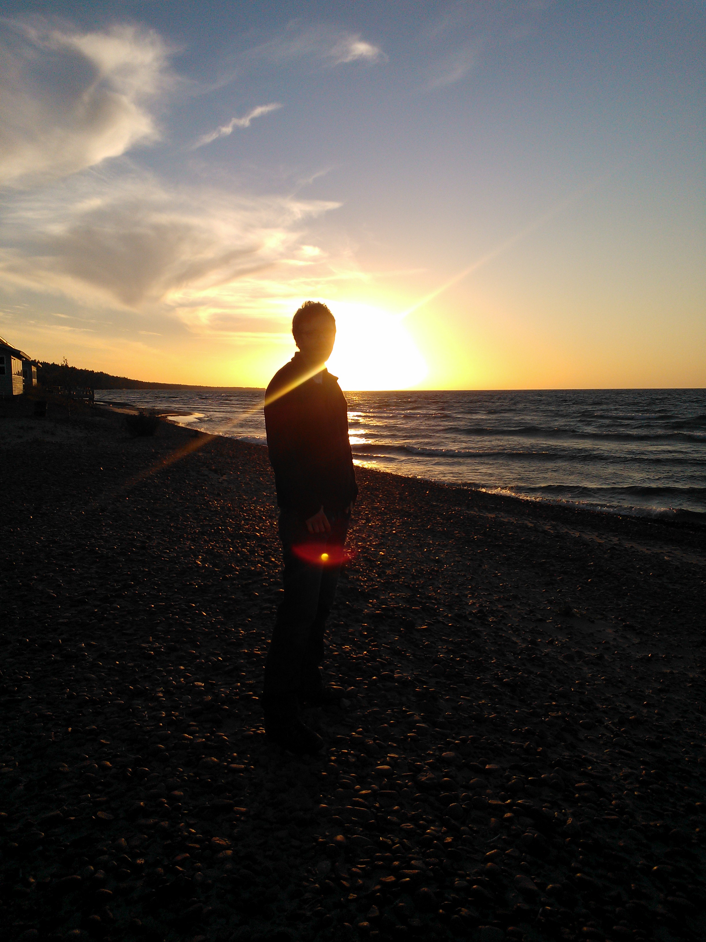 We had supper at Fitzgerald’s in Eagle River just in time to catch the sunset over Lake Superior. A bit too chilly for a fire and roasted potatoes, but we couldn’t go home without a visit to one of our favorite spots. Here is MIchael framed by the sunset.