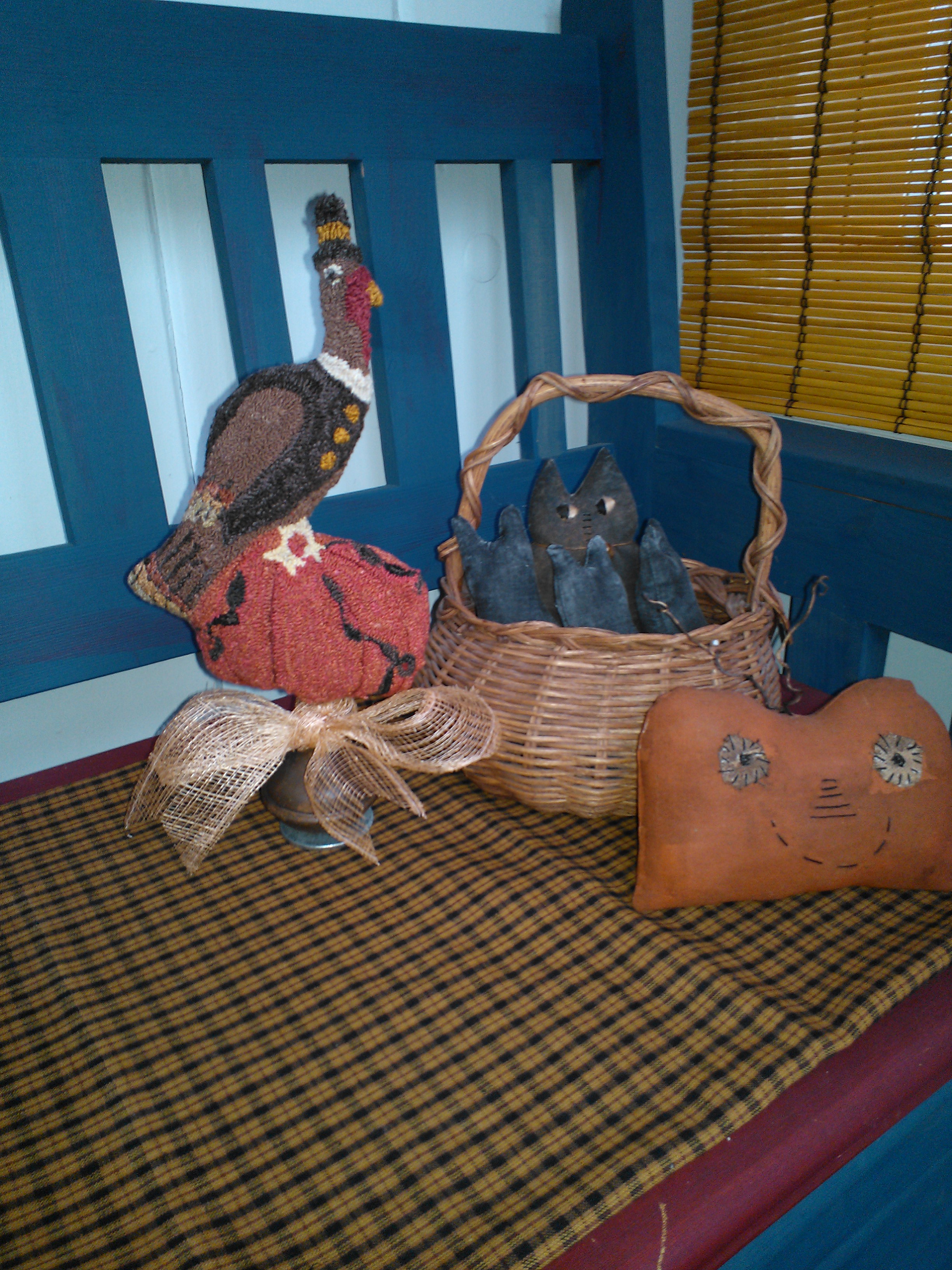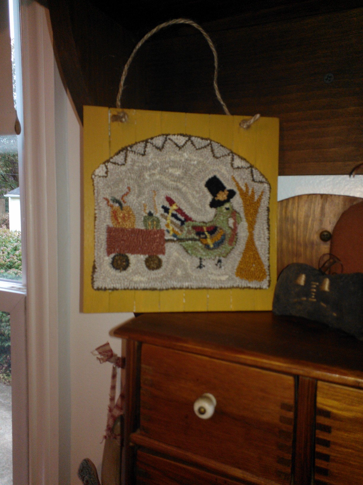 I am finally posting my completed Turkey on Pumpkin from the pattern so generously provided by Cathy Sowers. As you see, I was able to solve the problem of the tipping doorknob with the addition of a large washer.