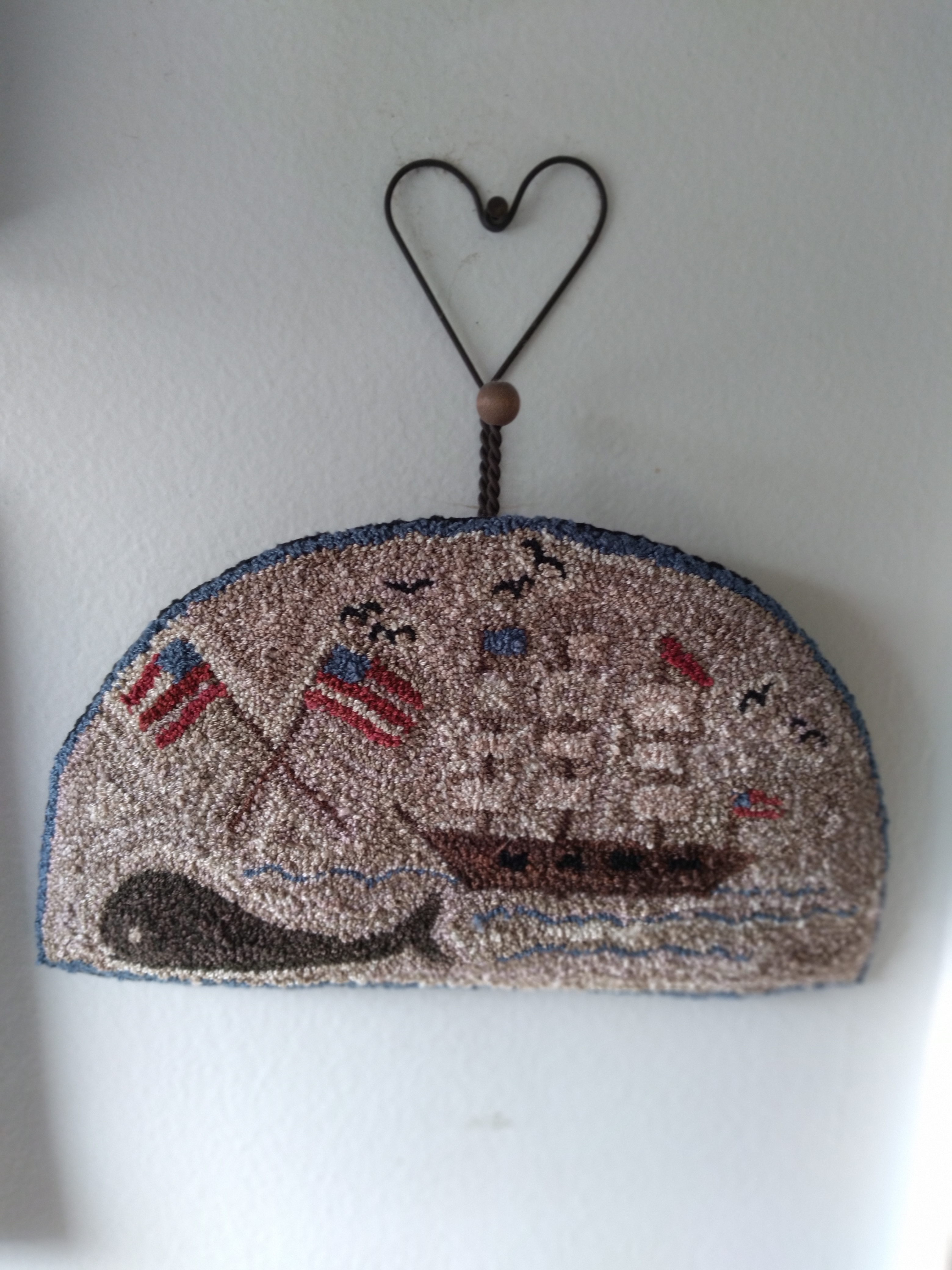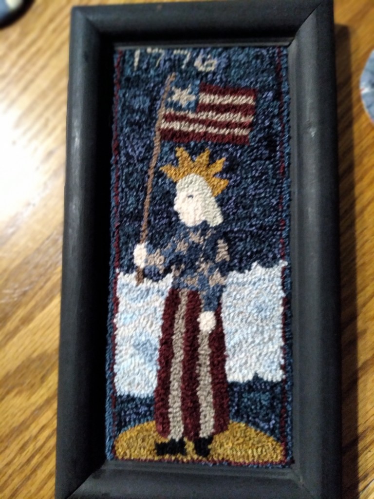 I came to a decision on Lori Rippey’s American Whaler. It is going to ba a stand-alone piece. It is finished with a black wool backing. I covered a little plastic ring with perle cotton to serve as a hanger. It resembles the blind pulls we used to find at the dime store. Remember both of those?