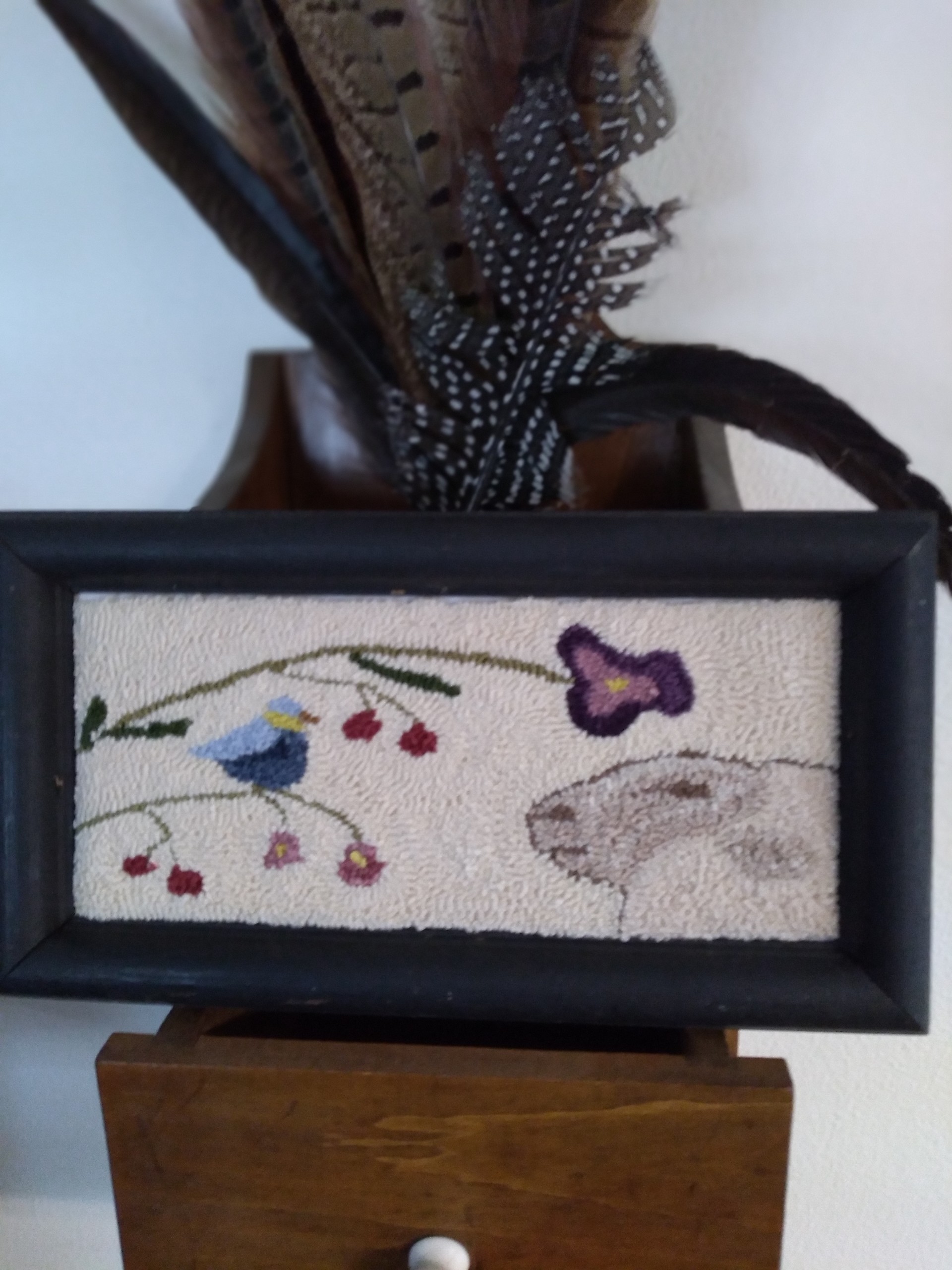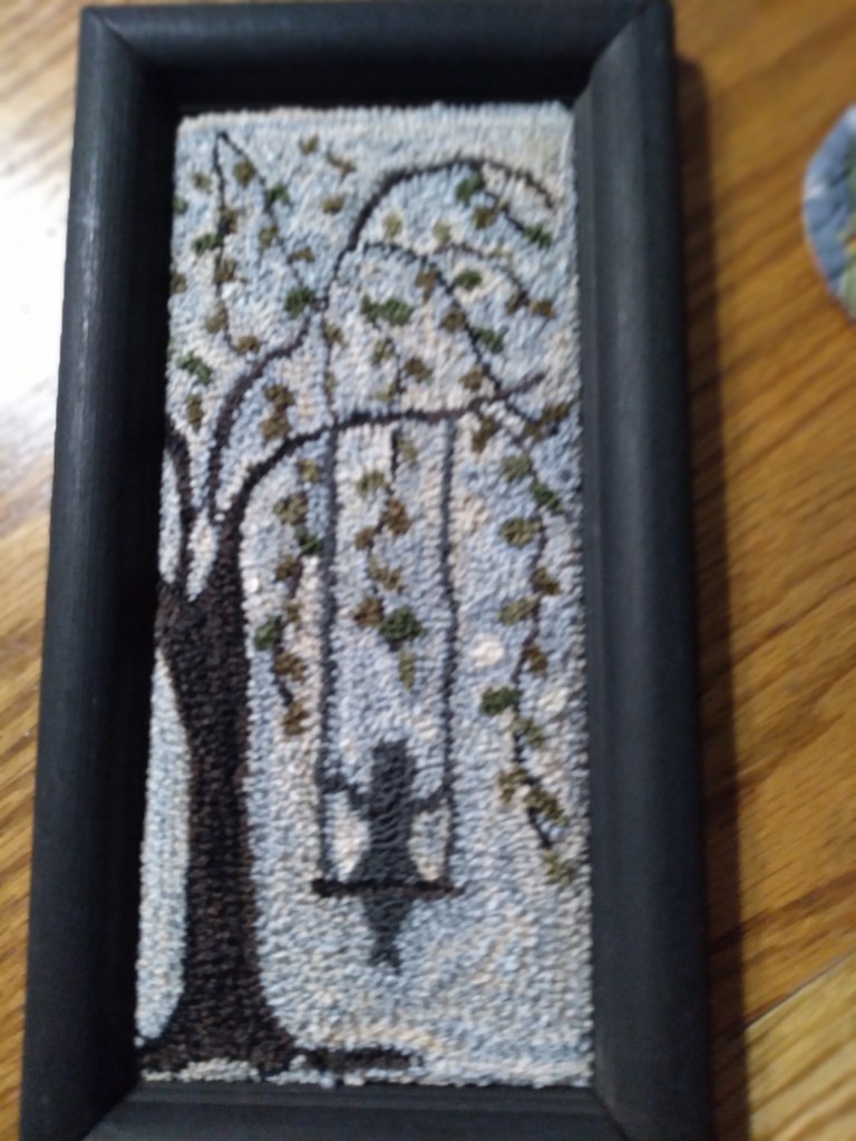 This first one is from a pattern I’m quite sure I found in the Punch Needle Primitive Stitcher magazine. I’m sorry to say I can’t find the designer’s name. The bird is done with a small needle and one thread. I’m happy with how the detail turned out