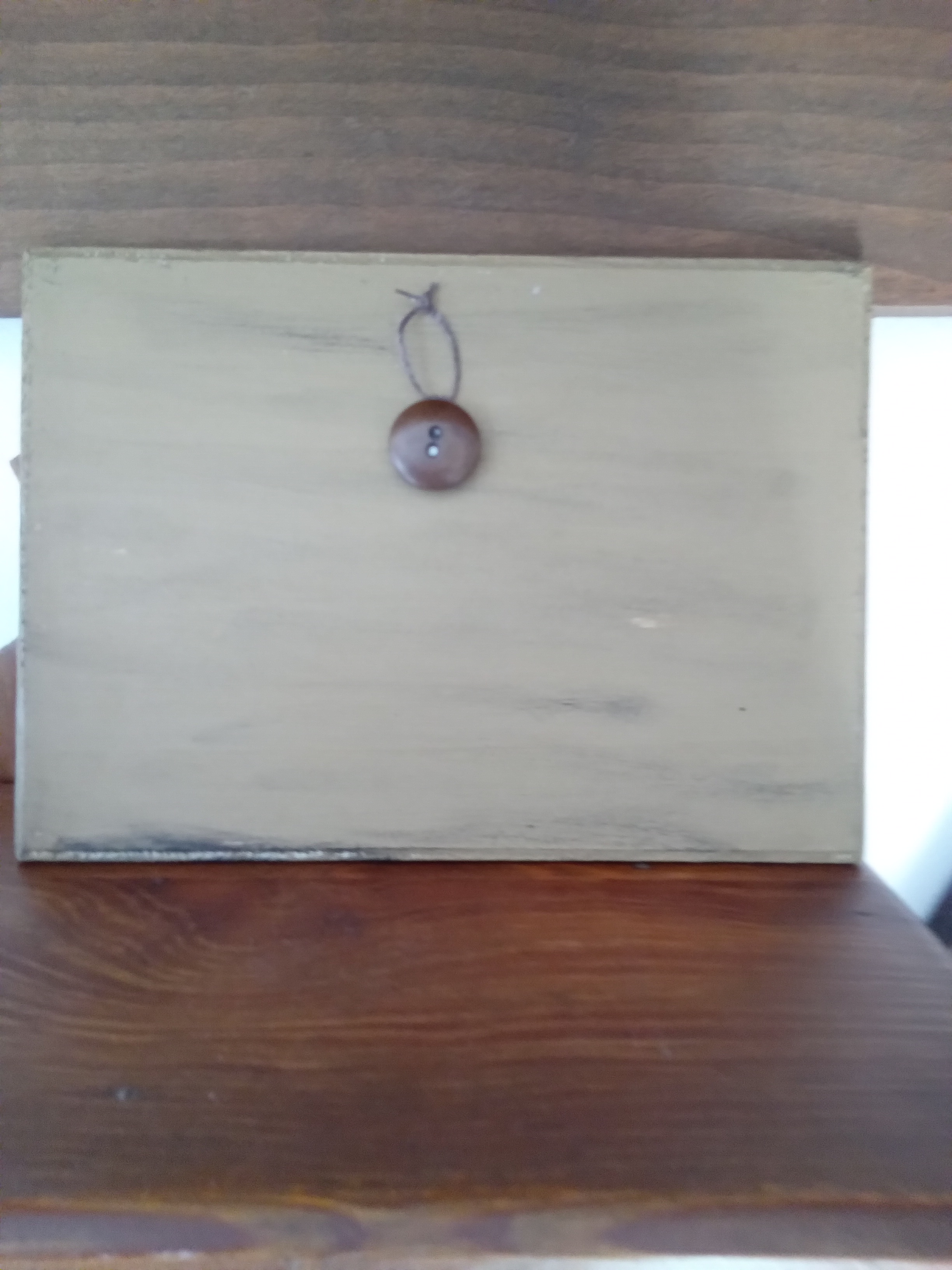 I’m excited to share more finishes with you today. I revisited some of my posts from years ago and rediscovered a great tip for hanging pieces. As you know by now, I’m very big on the prim style. And the philosophy of ‘make do.’ This little running rabbit is my pattern and I’ve done variations of winter and spring pieces. The board I got either at Michael’s or JoAnns. It’s thin and not suitable to use screw eyes. So this is what I came up with. I glued a button on the back an used waxed thread, which you can find in the jewelry section of any craft store. Look for a button that is a little thick on one side and glue that side to whatever you want to hang. This gives you space to wrap the waxed thread around it.