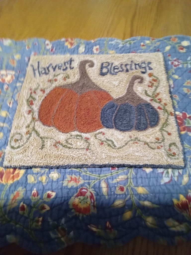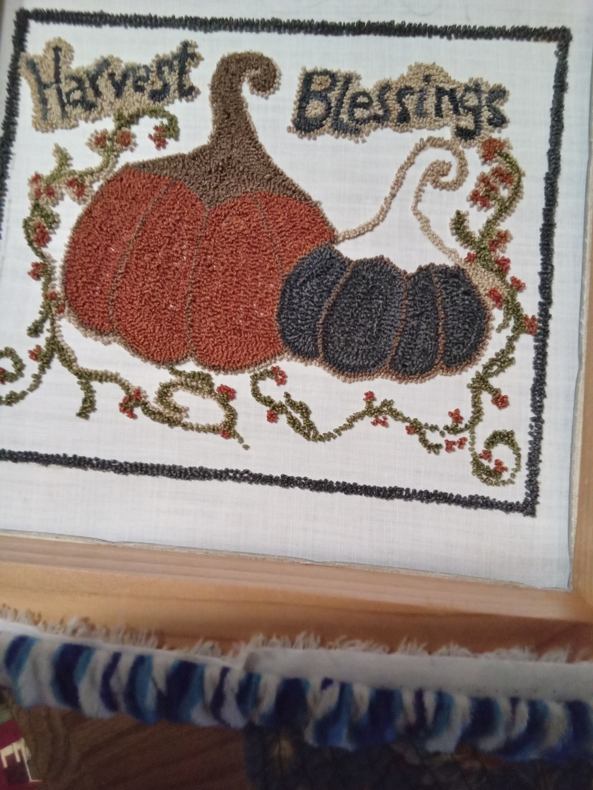 I have three pieces on frames. I’ll share Harvest Blessings from Julie Zakrzewski at My Primitive Heart. I’m down to punching the stem on the black pumpkin and filling in the background. As has been the case lately I’m going to run out of the background color before I run out of background. Grrr!! I used my wooden frame with carpet tacking to hold the cloth in place. The blue and white covering is made from steering wheel covers and helps keep you from poking yourself with the tacking.