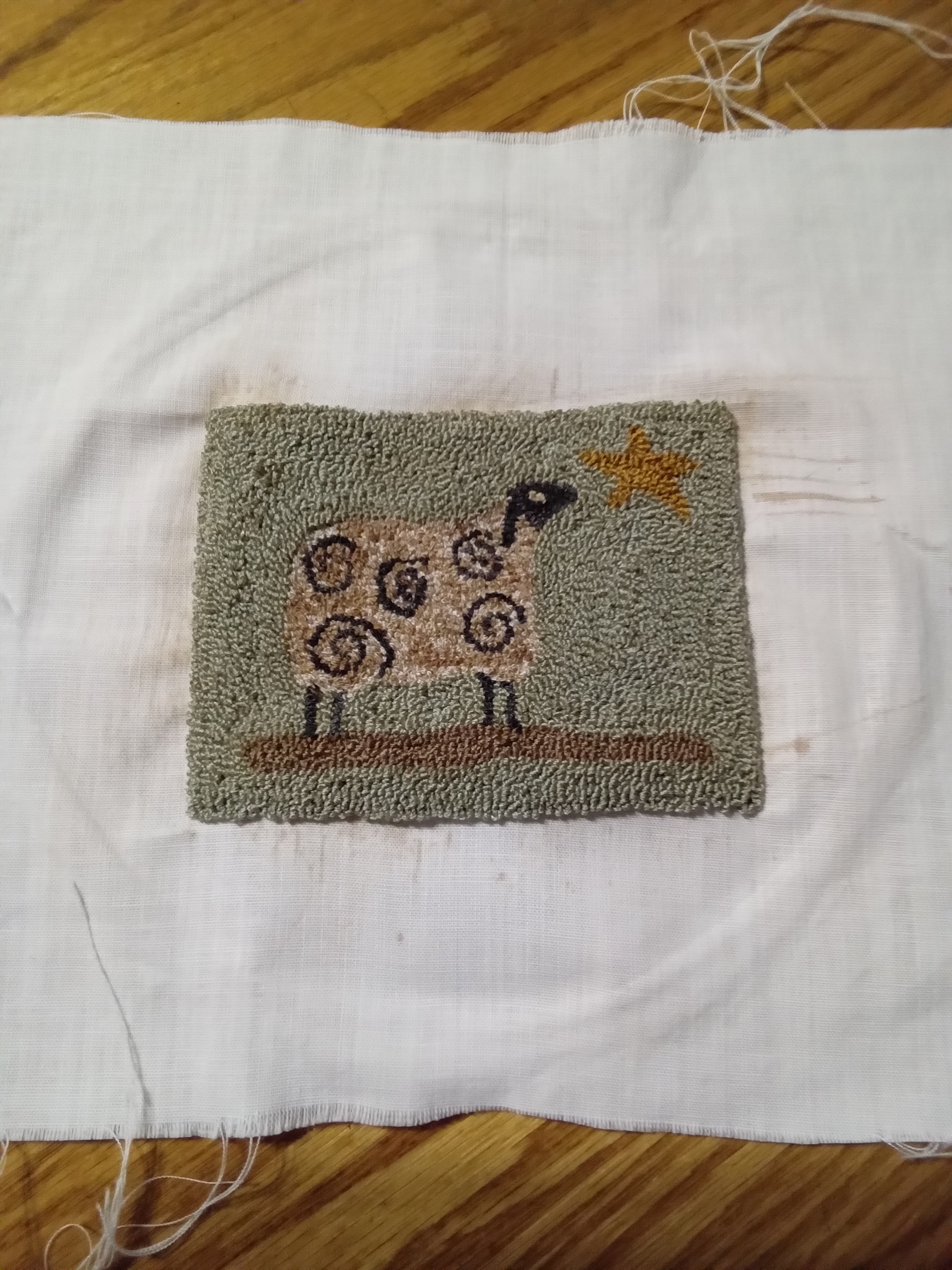 Greetings on this fine November Saturday morning. Today I have two pictures showing the difference you can make with the same piece. This little sheep was done with DMC floss in the background the the sheep itself was done in Valdani P4. Usually when I punch with the varigated Valdani threads I don’t do anything to the finished piece. Some people use strong coffee and will soak the piece in water, squeeze out the excess and then soak it in a bowl of cold dark coffee. After a few minutes remove it from the coffee and squeeze it out. If you leave it wadded up you will get random spots darker than others. So, that’s one way to achieve the aged look. I like to use walnut crystals. I purchased a little bag 8-9 years ago and mixed a few tablespoons into a pint mason jar of water and haven’t used it up yet. Of course, I don’t age everything I punch. I use a paint brush and brush the liquid walnut crystal water over the piece. You can use as little or as much as you want. If in the end you just don’t like it you can soak your piece in water and the stain comes out. I probably mentioned this before, but I steam press all my pieces before finishing them. (Always with a pressing cloth. Mine is a linen dish towel I got as a wedding present from my cousin 50 years ago. Pressing directly on weavers cloth will melt the polyester muck up your iron.) Steaming it seems to ‘pull’ it back into shape. It also helps the errant loops showing on the front side. Those loops can be snipped or you can use your punchneedle to push them back to the back side. Anyway, this is about staining, so let’s continue. Toggle the arrows to see each picture fully. You decide. Which do you like. If you like the prim look, here’s how to get it.