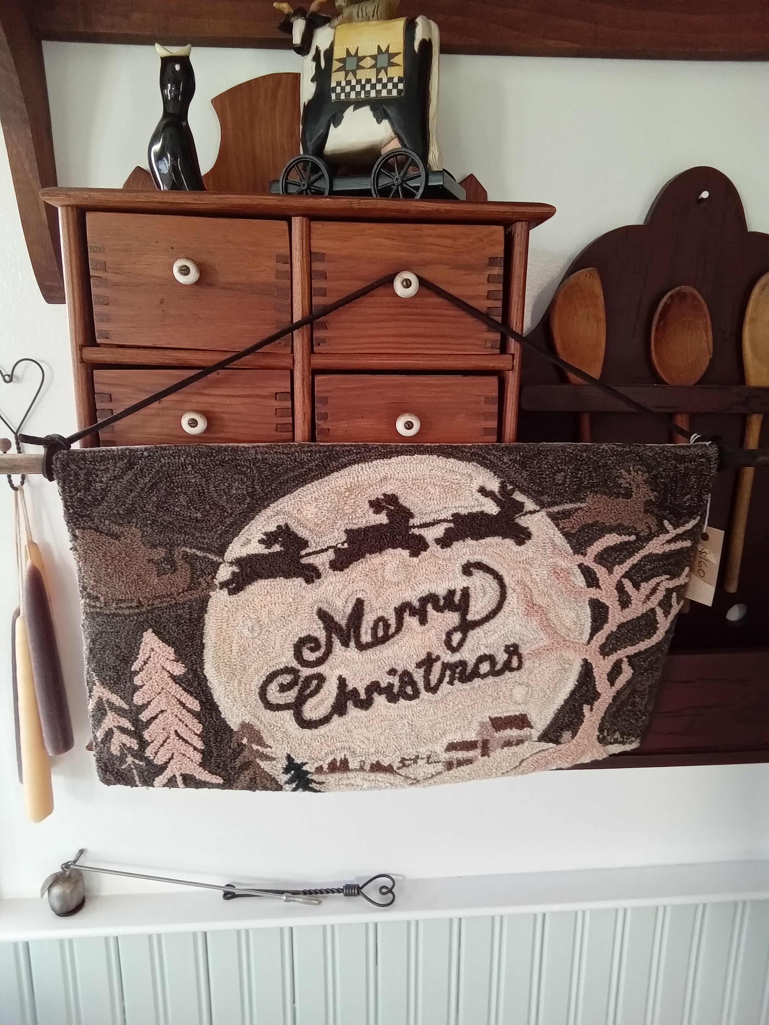 Let me start with Santa’s Midnight Ride. This was from Jeannine Happe at Two Old Crows. Punching this one took more than a few nights, but it was a fun project. Much of the piece is punched at a deeper loop, which really makes it pop. I backed it with a brown cotton print and a sleeve of the same fabric. I stained a dowel and used buckskin cording for hanging.