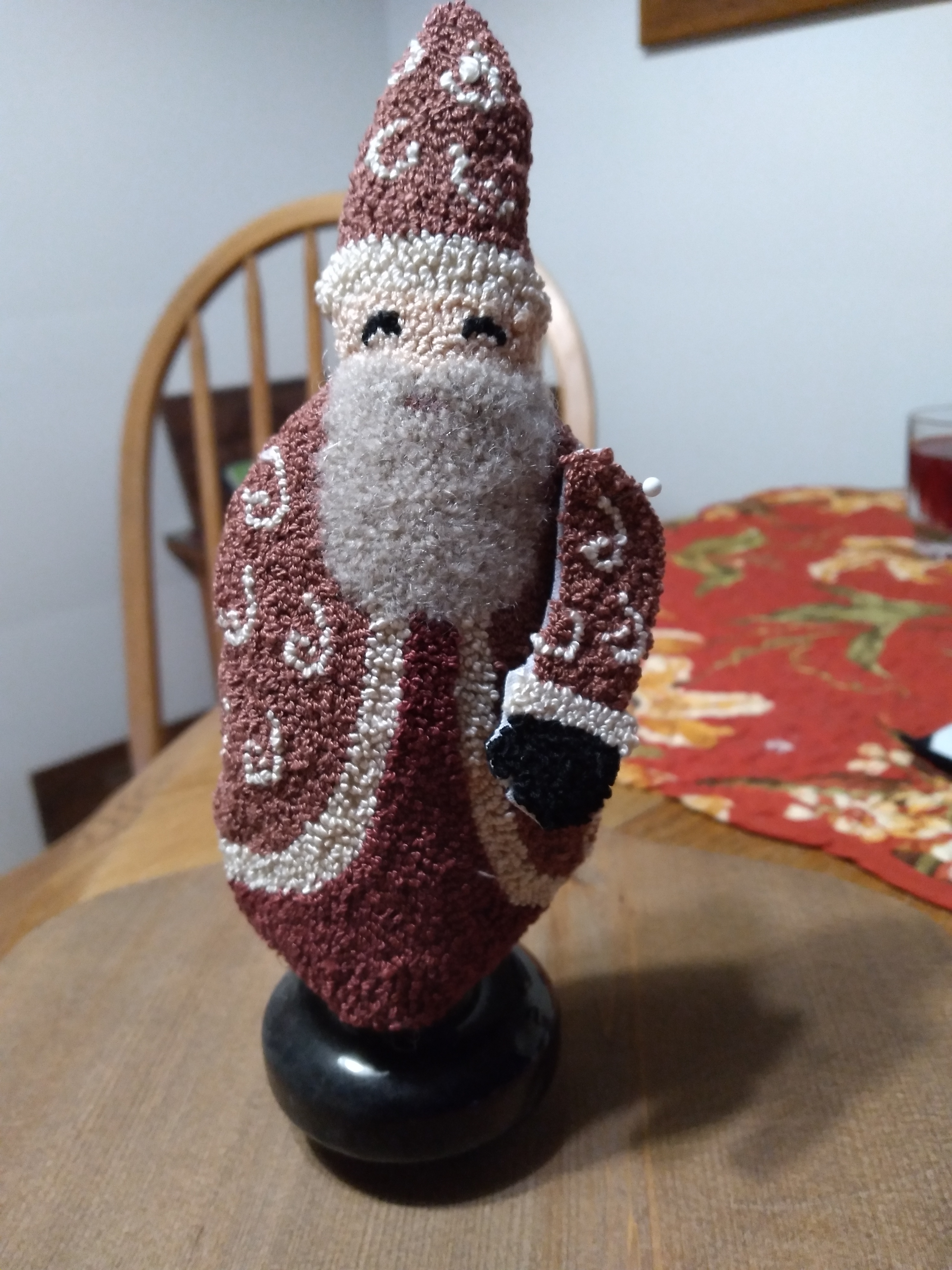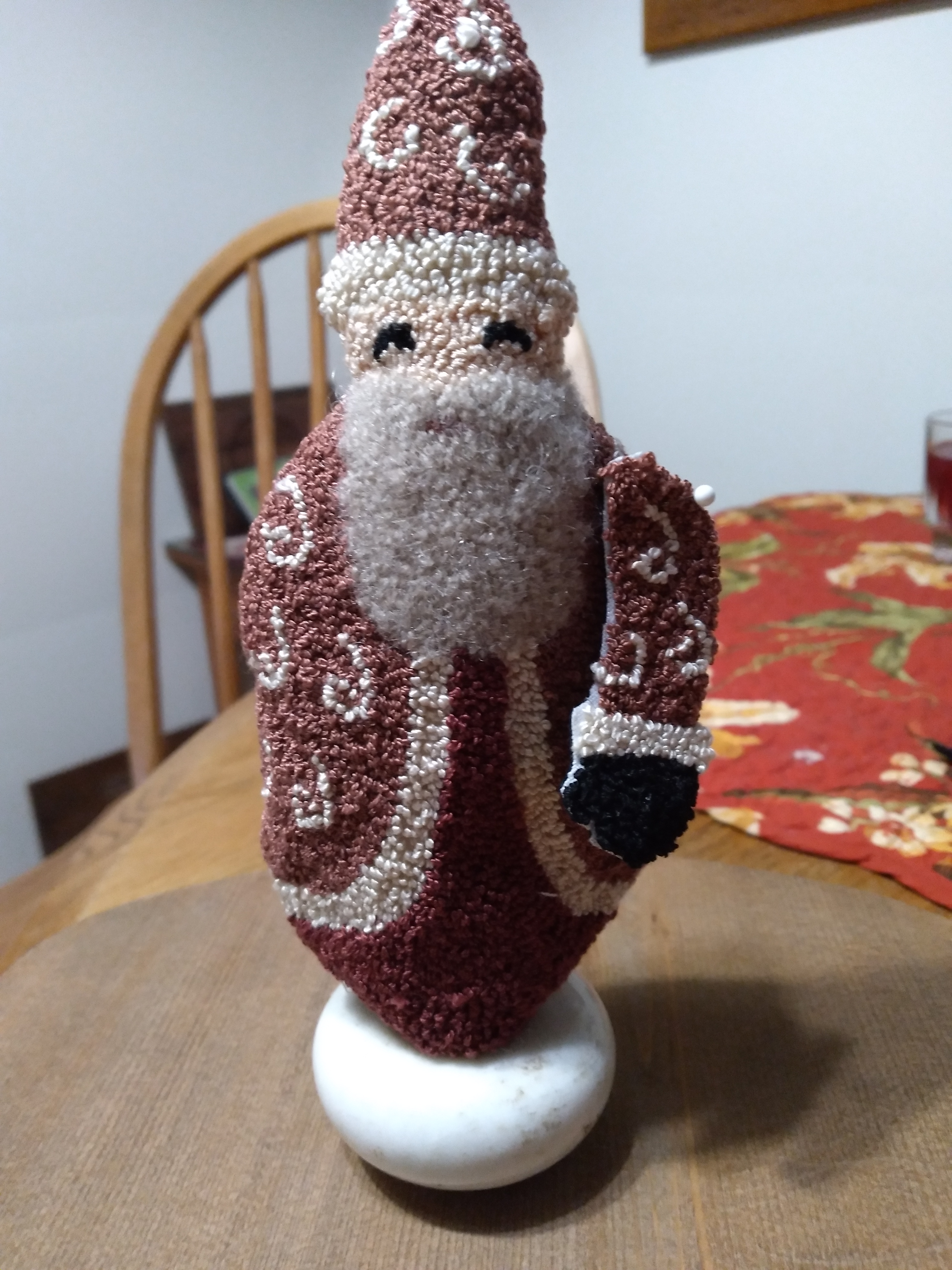 Meanwhile, I am working on some things for Christmas. Here is Father Christmas. These pictures show works in progress. I have one arm pinned on right now. Of course there will be another arm and he will hold a small Christmas tree. I used mohair for his beard. This is a pattern I drew. As soon as I get the picture uploaded feel free to copy it. No pattern, just a pic you are free to play with. I’m deciding if I want the doorknob base in black or white. What do you think?